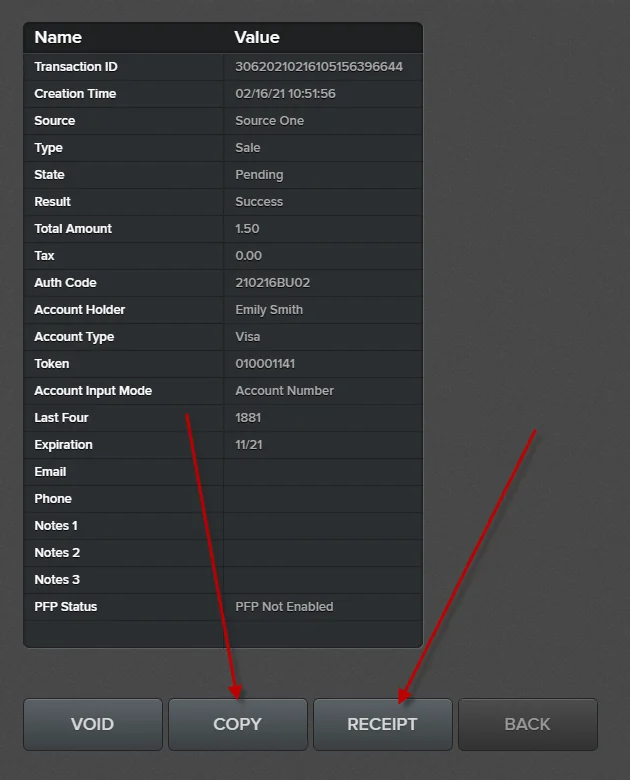 Once the pop-up has been cleared, the Type is changed from Authorized to Sale and the State is changed from Authorized to Pending. The transaction is ready to be captured by the nightly settlement process.
