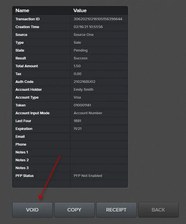 To Void a transaction, select the “VOID” button from the Transaction Details page.