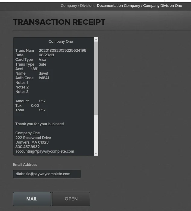 The Email Address will be pre-filled with the one that may have been associated with a transaction. If the Email Address is blank, or a different one is required, enter the new email address into the Email Address field and Select “MAIL”.