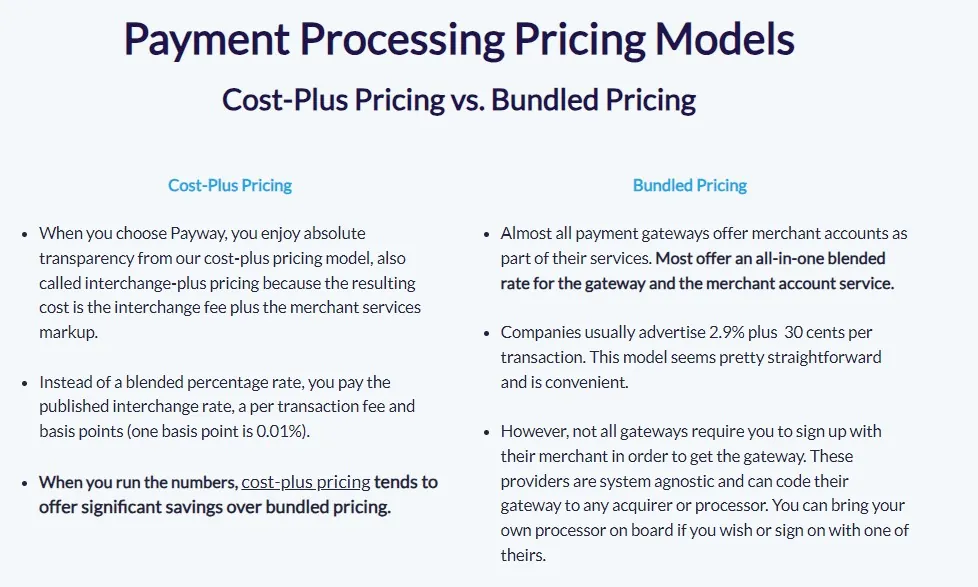 As a business owner, managing your finances efficiently is paramount to your success. One of the key financial decisions you’ll face is choosing an issuing bank for your merchant account. There are different payment models an issuing bank may charge you for opening a merchant account. Two common pricing models are Cost-Plus Pricing (also known as Interchange Pass-Through Pricing) and Bundled Pricing, often referred to as Flat Fee Pricing.