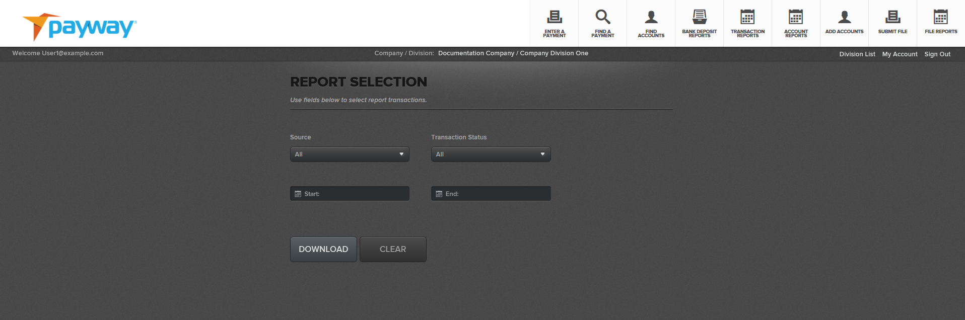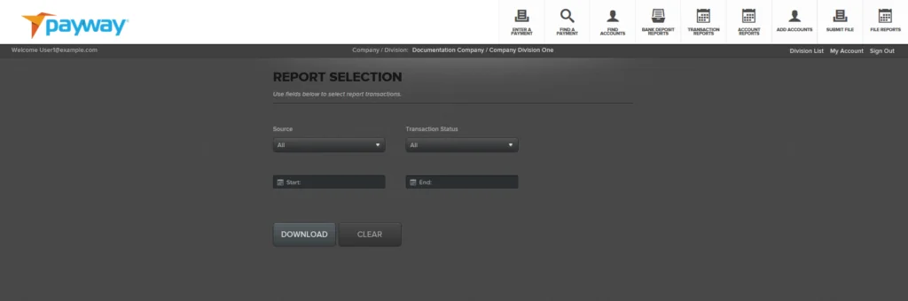You can select all or an individual source and transaction status (See Appendix A) and/or a specific calendar date range. It is required that you specify a start date and end date.
